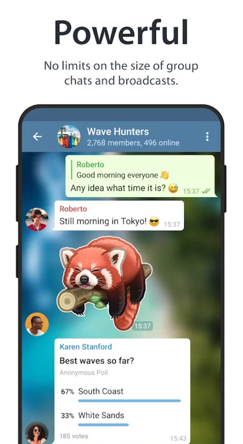 - Групповые чаты — до 200 000 участников (в последних версиях лимит значительно вырос). Можно назначать администраторов, закреплять сообщения, использовать упоминания @all.